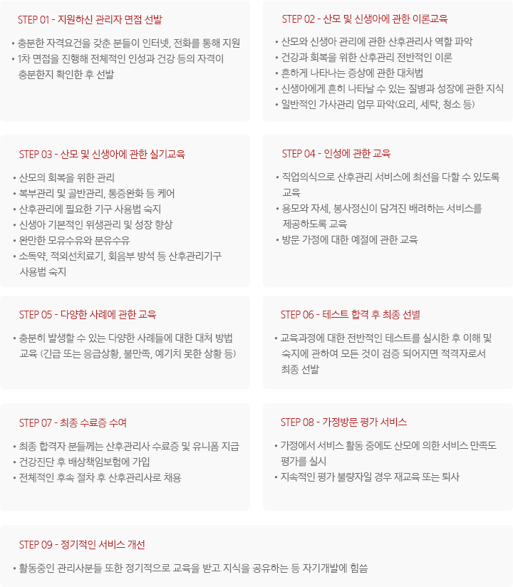 조건에 맞춰서 선발된 관리사분들은 산모의 산후관리와 신생아 돌보기의 이론과 실기를 수료하신 뒤, 건강진단과 배상책임보험을 가입하고, 인성 및 예절교육을 완벽하게 숙지하신 분들이 함께 하시게 됩니다.